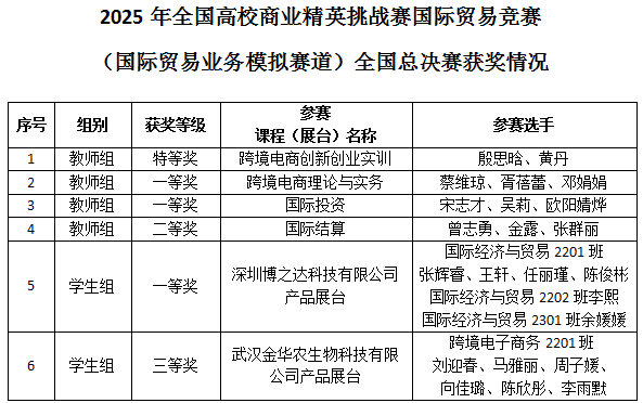 2025年全国高校商业精英挑战赛国际贸易竞赛总决赛近日圆满落幕,来自全国198所高等院校的408支参赛团队入围本届全国总决赛。我校金融与经济学院4支教师队伍和2支学生队伍参加国际贸易业务模拟赛道,荣获教师组特等奖1项、一等奖2项和二等奖1项;学生组一等奖1项和三等奖1项;学校荣获“最佳组织奖”。